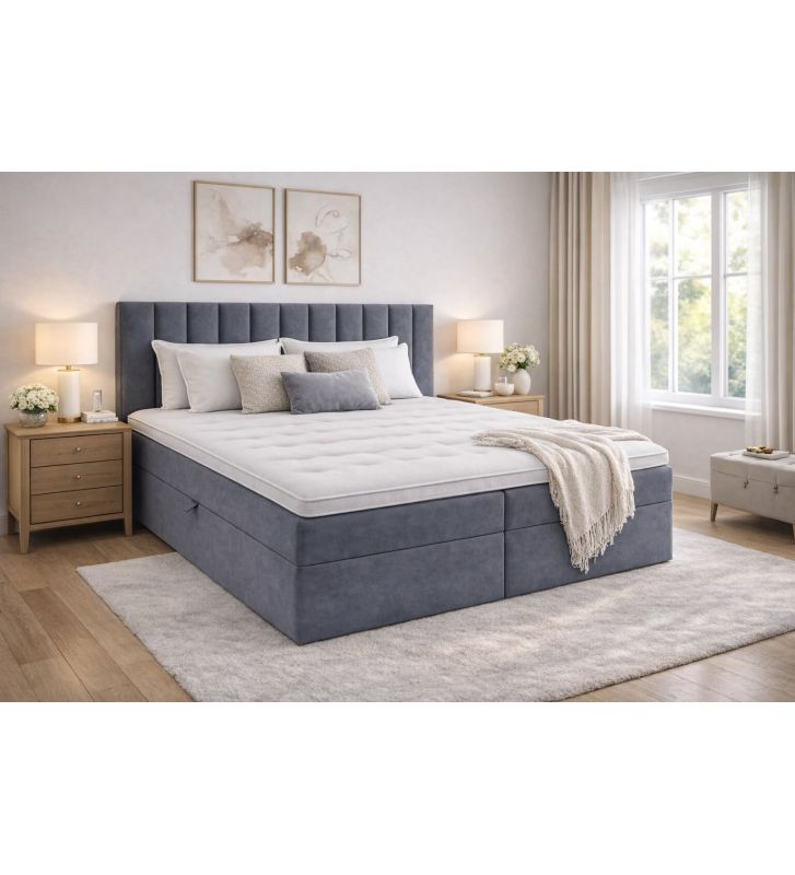 Łóżko kontynentalne BERGAMO wyposażone jest w materac bonellowy oraz bezpłatny topper eliminujący przerwę między materacami. Model oferuje dwie pojemne skrzynie na pościel z automatem sprężynowym, co łączy wygodę spania z praktycznym przechowywaniem.