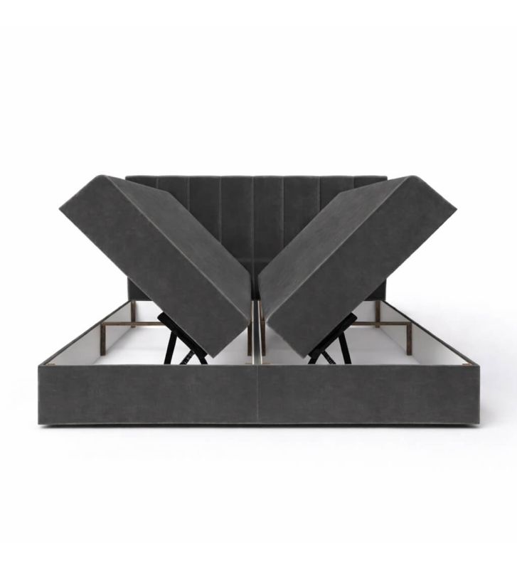 - Dwie pojemne skrzynie na pościel: System z automatem sprężynowym ułatwia dostęp do przestrzeni do przechowywania. Duże pojemniki pomagają utrzymać porządek w sypialni i miejsce pod stelażem.