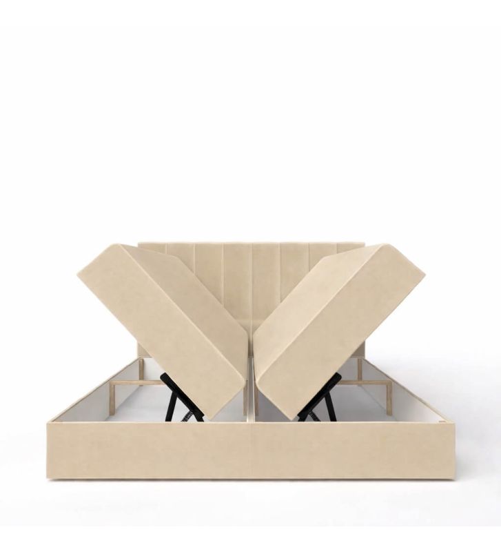 - Dwa pojemne pojemniki na pościel: Łóżko wyposażone jest w dwie skrzynie na pościel z automatem sprężynowym, które ułatwiają przechowywanie pościeli i rzadziej używanych przedmiotów, zwiększając funkcjonalność sypialni bez konieczności dodatkowych mebli.
