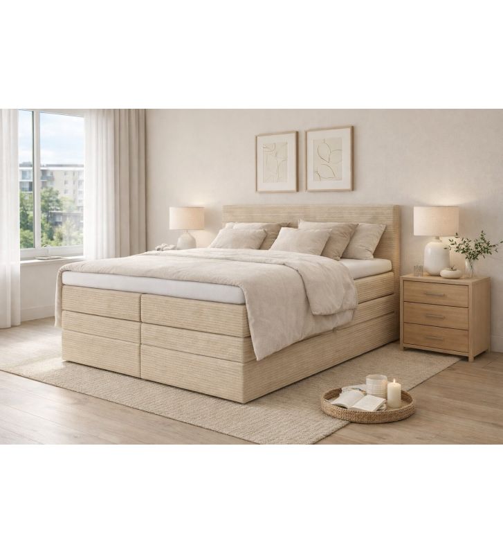Wyposażenie obejmuje dwie pojemne skrzynie na pościel z automatem sprężynowym oraz możliwość zamiany materaca bonellowego na materac pocket 7‑strefowy, czyli z niezależnie działającymi sprężynami. Zagłówek ma grubość 10 cm i wysokość 110 cm, co wpływa na wygląd i proporcje mebla.