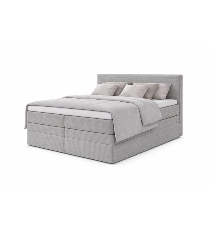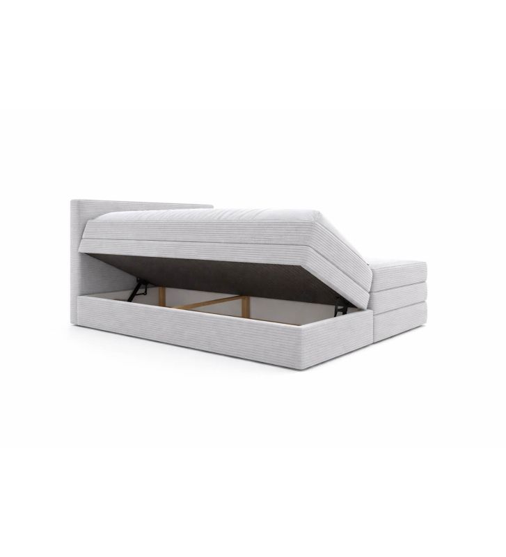 Łóżko wyposażone jest w dwie pojemne skrzynie na pościel z automatem sprężynowym, ułatwiające przechowywanie i dostęp do pościeli. Dostępna gama tkanin obejmuje kolory: beżowy, szary, brązowy, grafitowy oraz czarny; dodatkowe warianty tkanin i próbki są dostępne na życzenie.