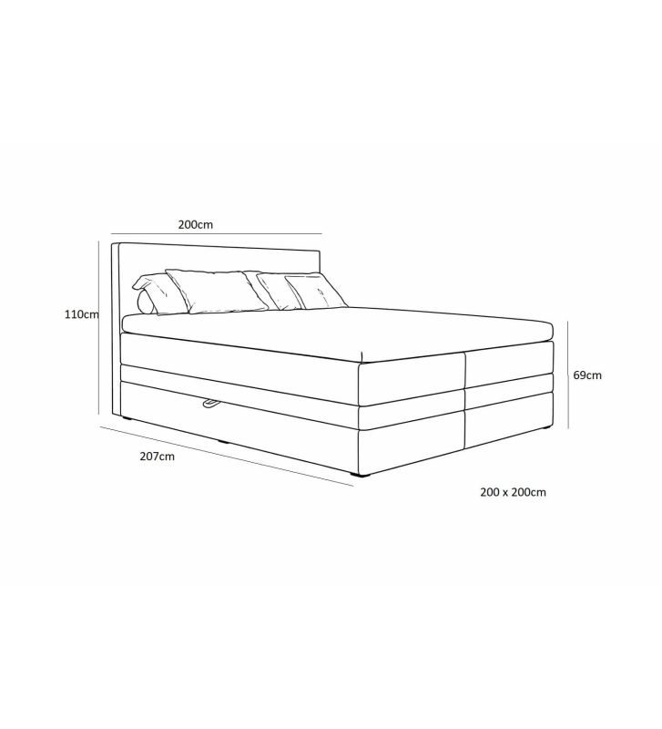 Model 200x200 oferuje powierzchnię spania 200x200 cm, a wymiary całkowite łóżka to 207 cm długości i 200 cm szerokości. Wysokość całkowita wynosi 69 cm, zaś wysokość zagłowia to 110 cm przy grubości zagłowia 10 cm. W ofercie dostępne są także inne rozmiary: 140x200 cm, 160x200 cm oraz 180x200 cm.