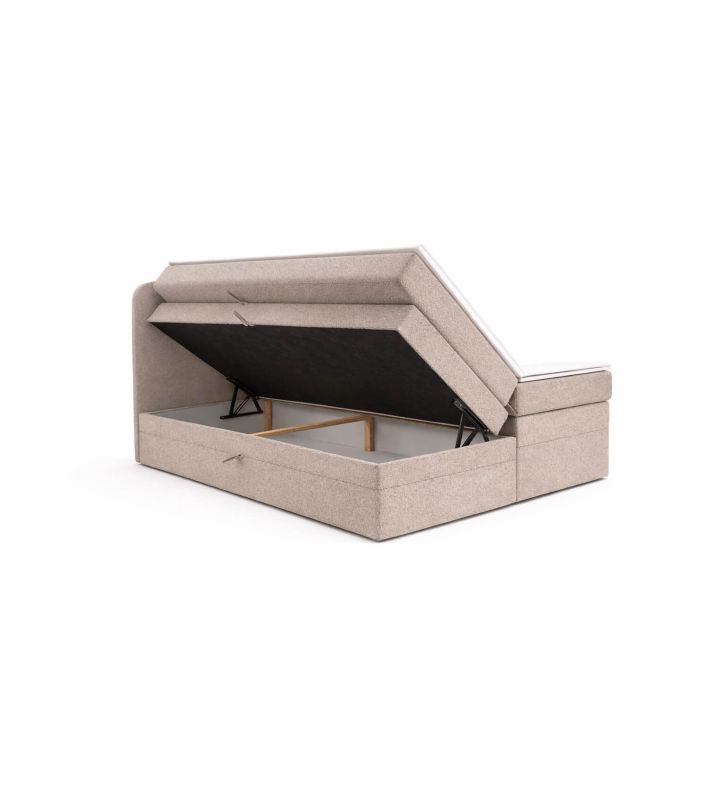 - Dwie pojemne skrzynie na pościel: Pojemniki zwiększają funkcjonalność sypialni. Automaty sprężynowe ułatwiają otwieranie i dostęp do przechowywanej pościeli oraz innych tekstyliów.