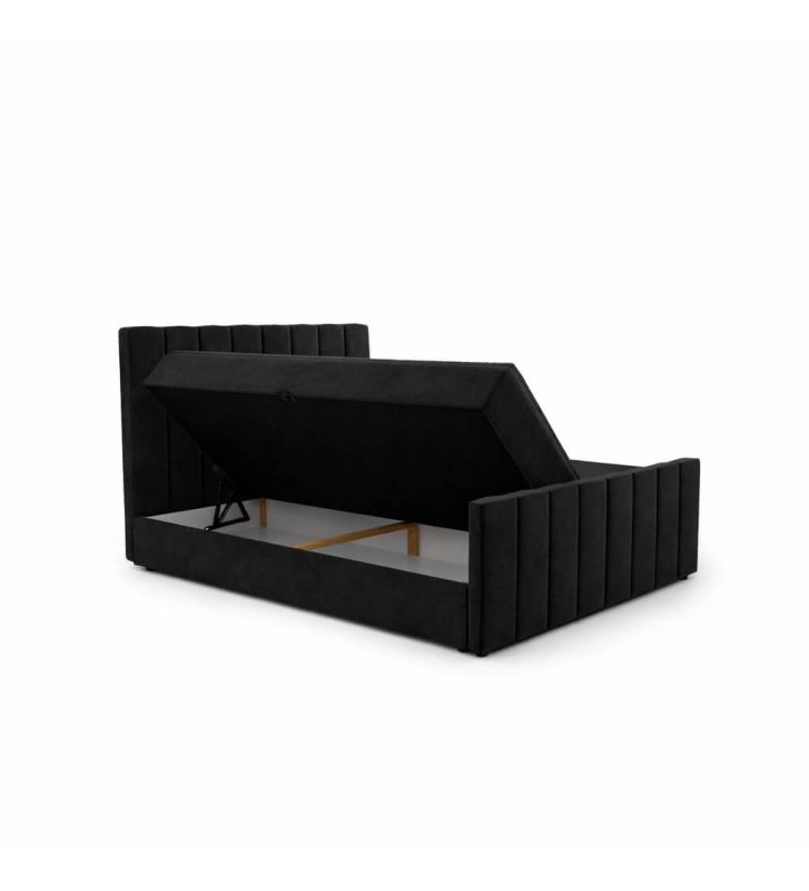 • Dwie pojemne skrzynie na pościel: Schowki pod stelażem zwiększają funkcjonalność sypialni, oferując miejsce na pościel i rzadziej używane tekstylia. Automat sprężynowy ułatwia dostęp do zawartości skrzyni.
