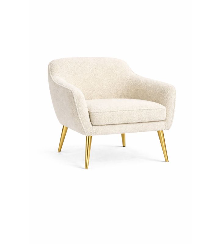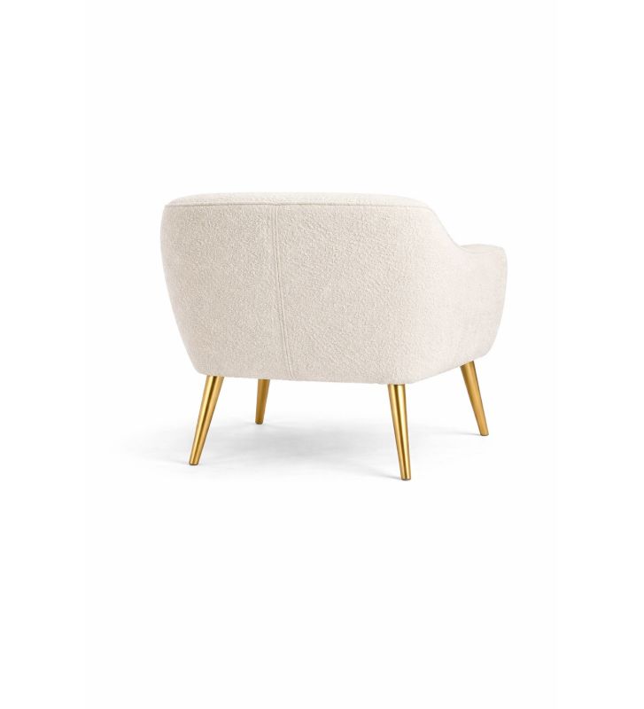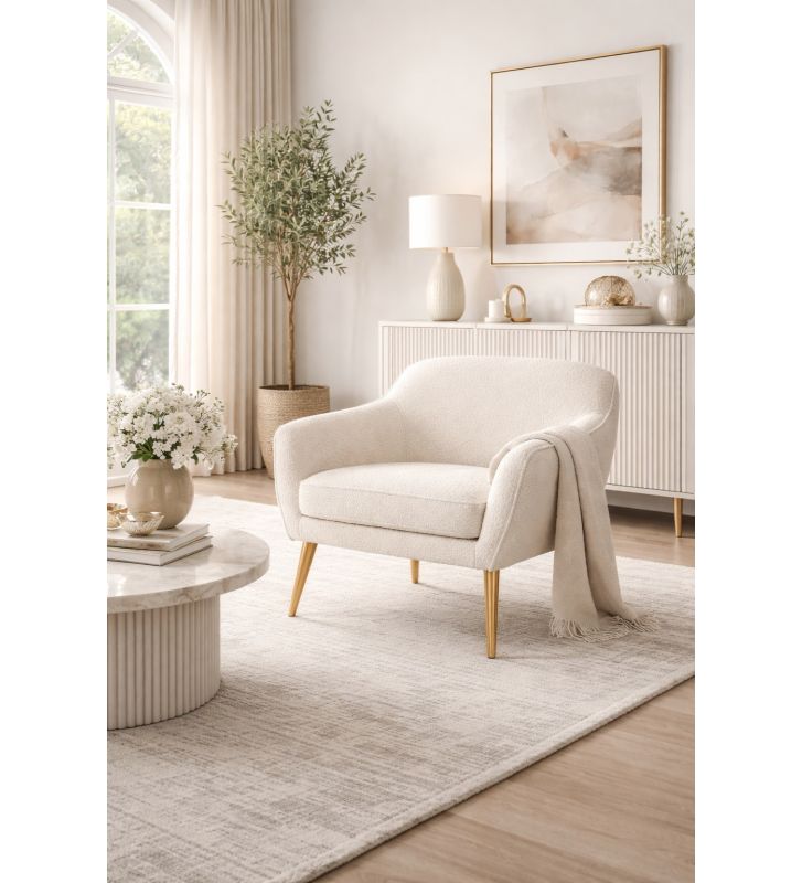 Fotel Livo to elegancki fotel wypoczynkowy w stylu skandynawskim, który łączy modną tkaninę bouclé z lekką, nowoczesną formą. Jasna, przytulna tapicerka pięknie ociepla wnętrze, a złote metalowe nóżki nadają całości stylowego i bardziej luksusowego charakteru.