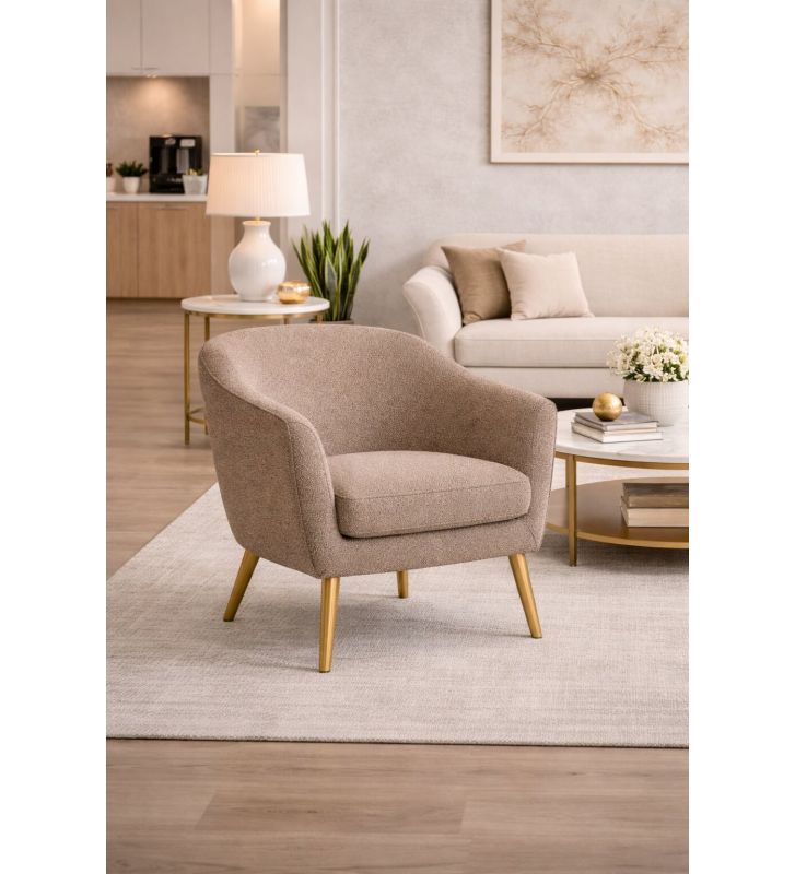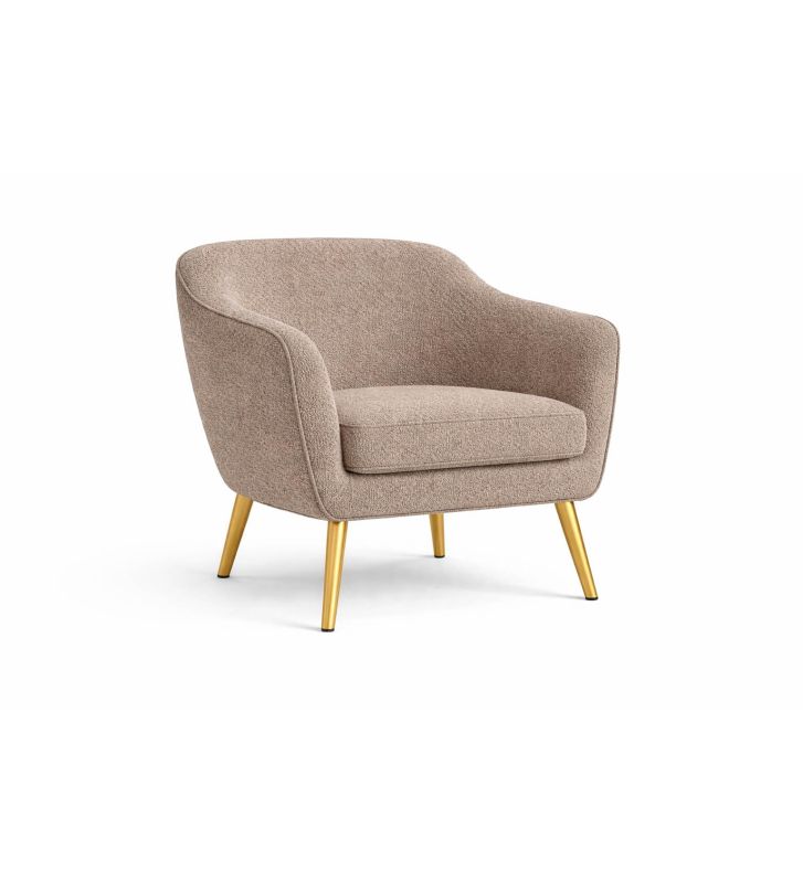 Fotel Livo to elegancki fotel wypoczynkowy w stylu skandynawskim, który łączy modną tkaninę bouclé z lekką, nowoczesną formą. Jasna, przytulna tapicerka pięknie ociepla wnętrze, a złote metalowe nóżki nadają całości stylowego i bardziej luksusowego charakteru.